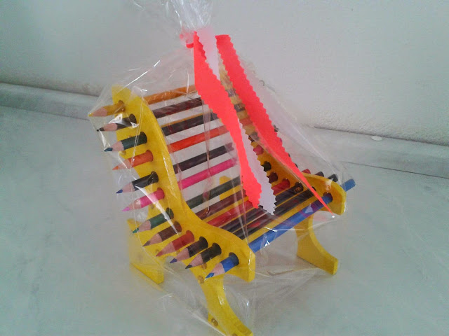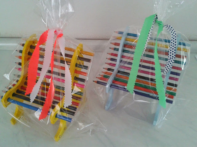 Cadeirinhas com lápis são sempre muito pedidas para arranjos de mesas de aniversário e para o dia das crianças.